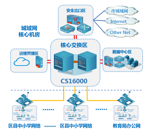 CS16000系列交换作为教育城域网的交换中心,承担各中心校网络、教育局局域办公网、数据中心的接入和转发,并通过安全出口区与市城域网等外网互通。